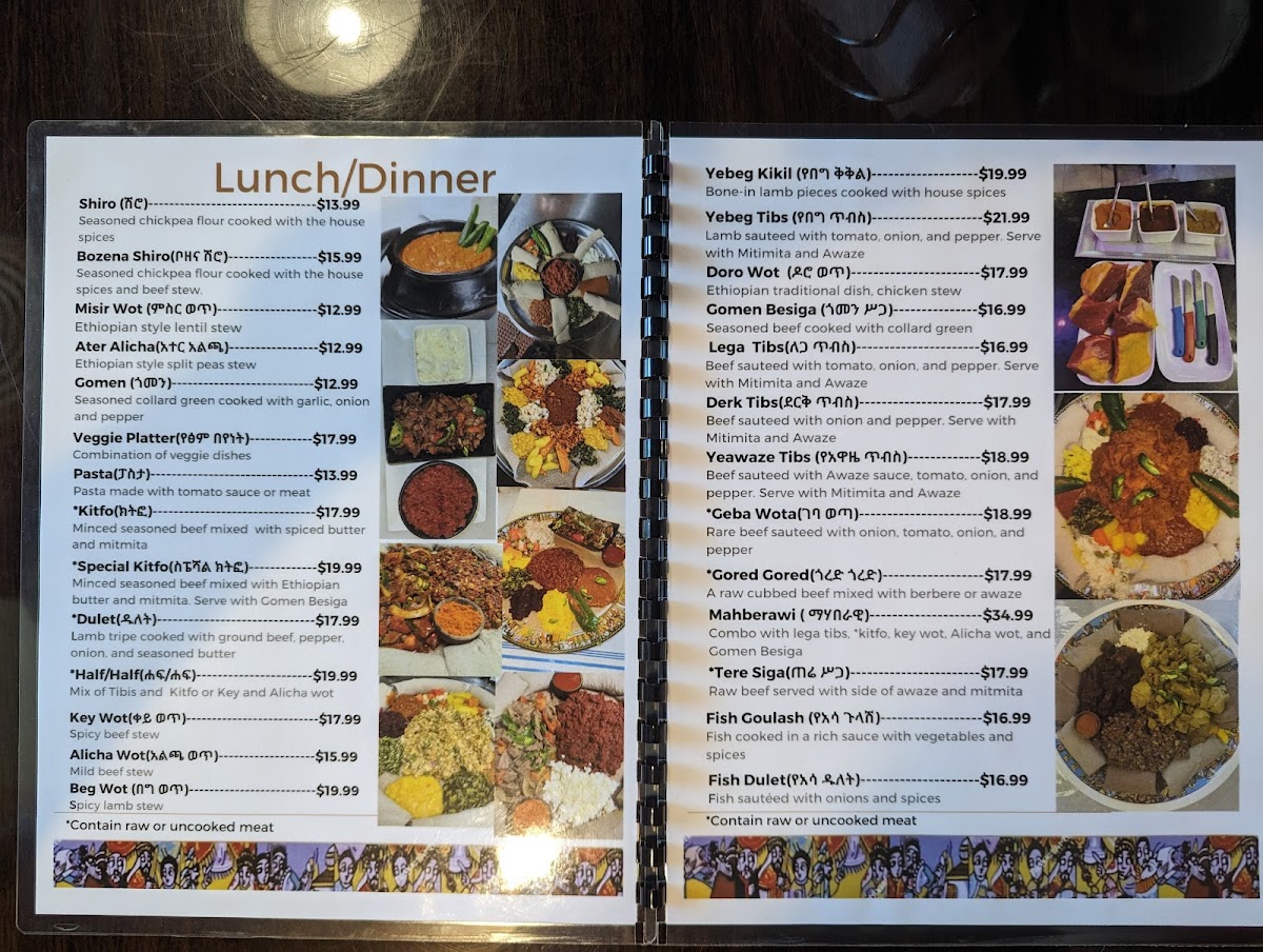 For lunch and dinner, the menu shines with robust stews such as Doro Wot, a spiced chicken classic, and Key Wot, a fiery beef stew that captures the boldness of Ethiopian spices. Vegetarian options like Misir Wot and Shiro Wot reflect authentic, hearty flavors. The Tibs—beef sautéed with fresh tomato and onion—showcase tender, well-seasoned meat that delights the palate.
