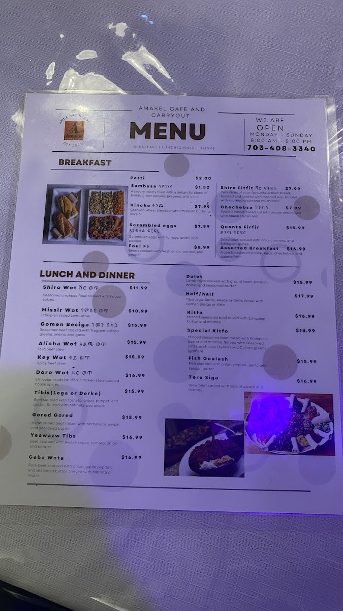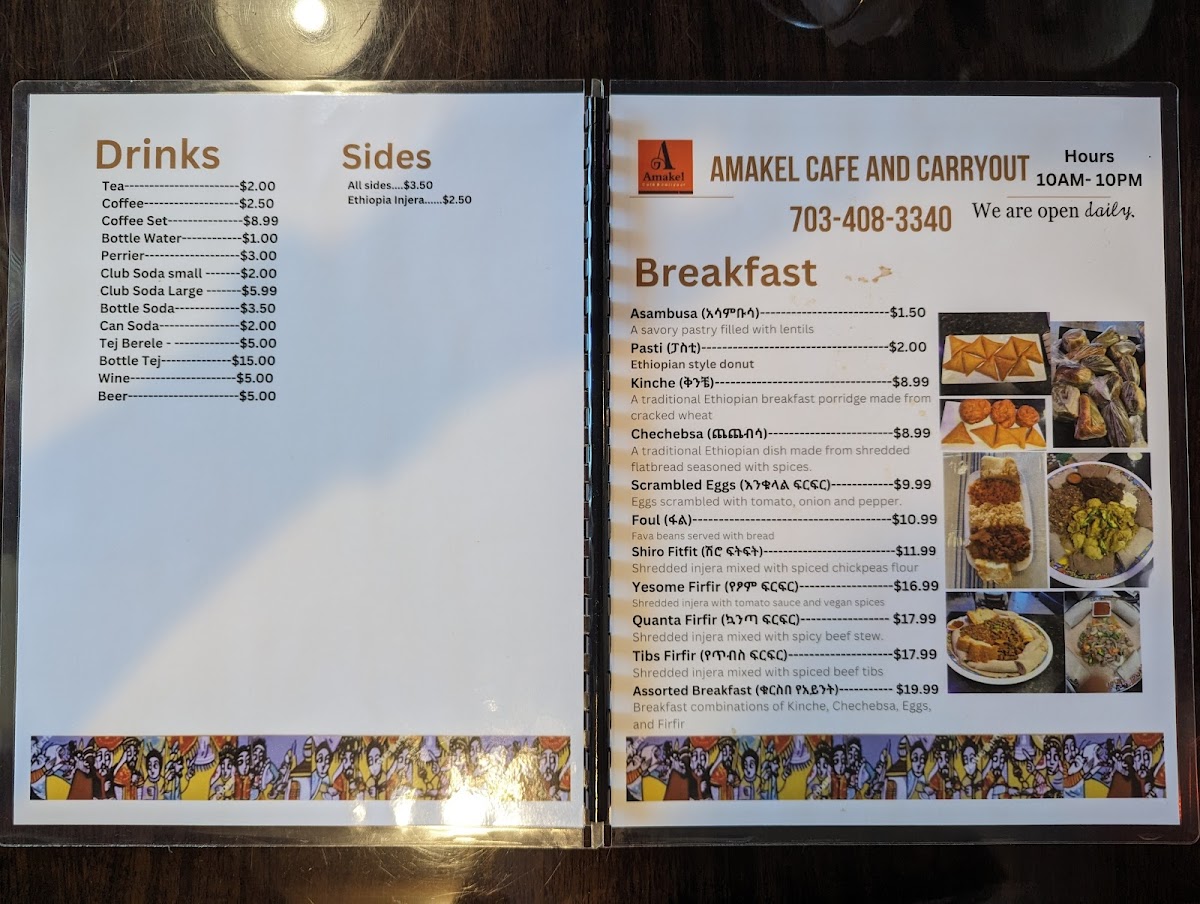 Amakel Cafe and Carryout offers an authentic Ethiopian culinary journey, highlighting traditional flavors rendered with care and consistency. Their breakfast menu features comforting staples like Sambusa, a savory lentil-stuffed pastry, and Kinche, cracked wheat enriched with Ethiopian butter. The Shiro Fitfit, a vibrant blend of shredded injera and chickpea flour stew, stands out as a wonderfully textured vegan choice.